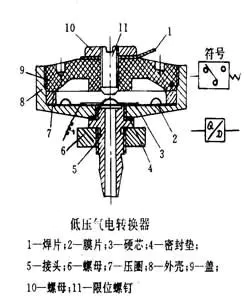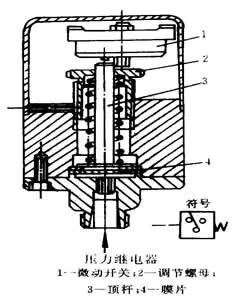 左圖所示為低壓氣電轉(zhuǎn)換器,硬芯3和焊片1是兩個觸點,無氣信號輸入時是斷開的。有一定壓力氣信號輸入時,膜片2向上運動帶動硬芯3和限位螺釘11接觸、與焊片1接通,發(fā)出電信號;氣信號消失時,膜片帶動硬芯復位,觸點斷開,電信號消失。調(diào)節(jié)螺釘11可以調(diào)整接受氣信號壓力的大小。右圖所示為壓力繼電器的工作原理固,輸入氣信號使膜片4受壓變形去推動*桿3啟動微動開關1,輸出電信號。輸入氣信號消失,膜片4復位,*桿在彈簧作用下下移,脫離微動開關。調(diào)節(jié)螺母2可以改變接受氣信號的壓力值。其結構簡單,制造容易,應用廣泛。